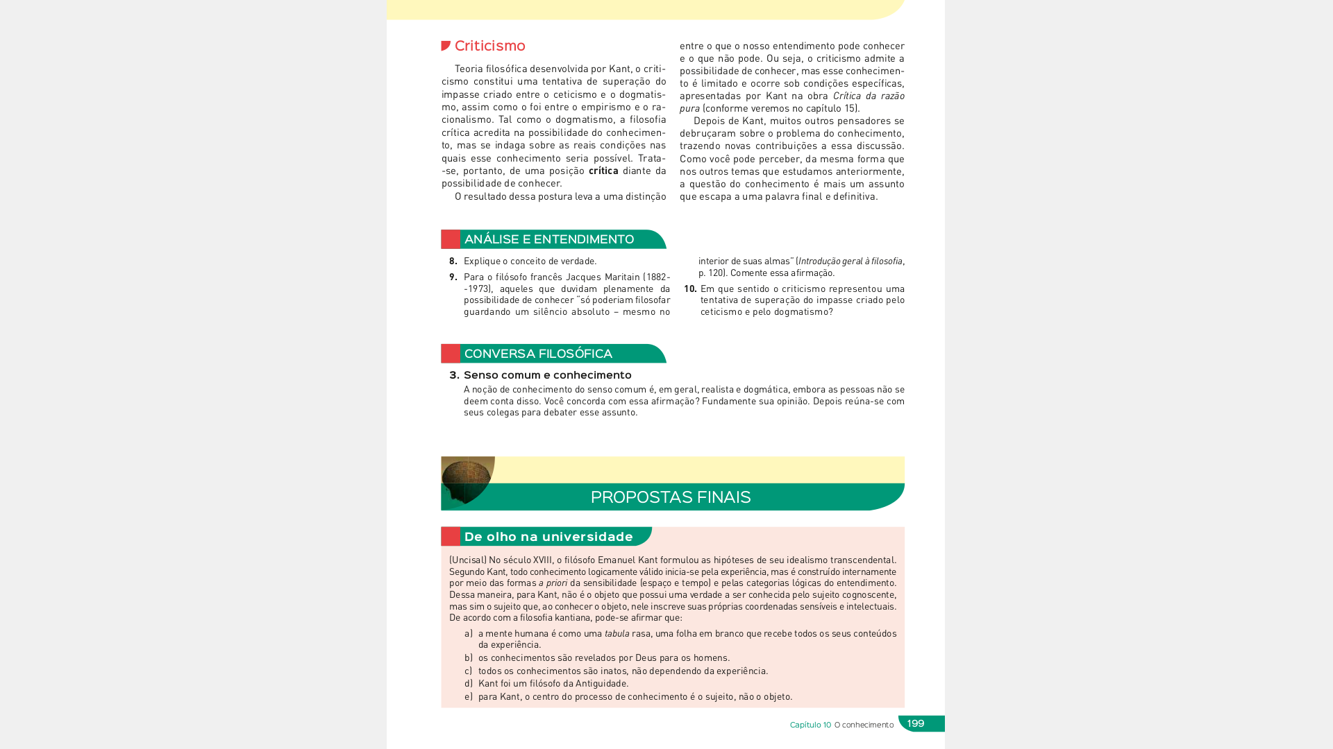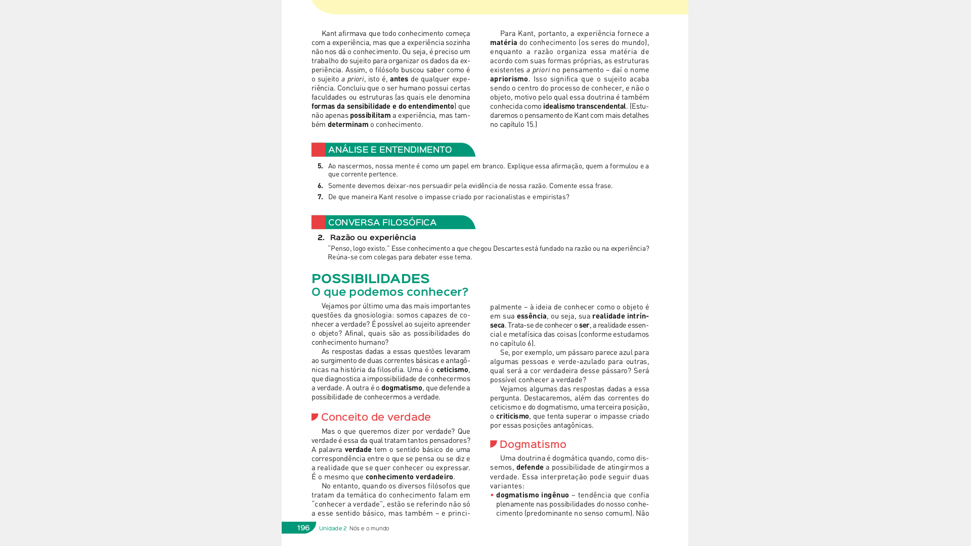 Dogmatismo crítico – tendência que defende nossa capacidade de conhecer a verdade mediante um esforço conjugado de nossos sentidos e de nossa inteligência. Confia que, por meio de um trabalho metódico, racional e cien-